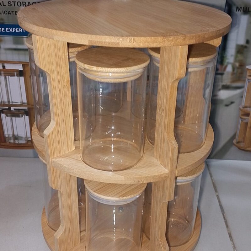 360° Rotating Bamboo Spice Rack with Glass Jars – Kitchen Countertop Spice Organizer