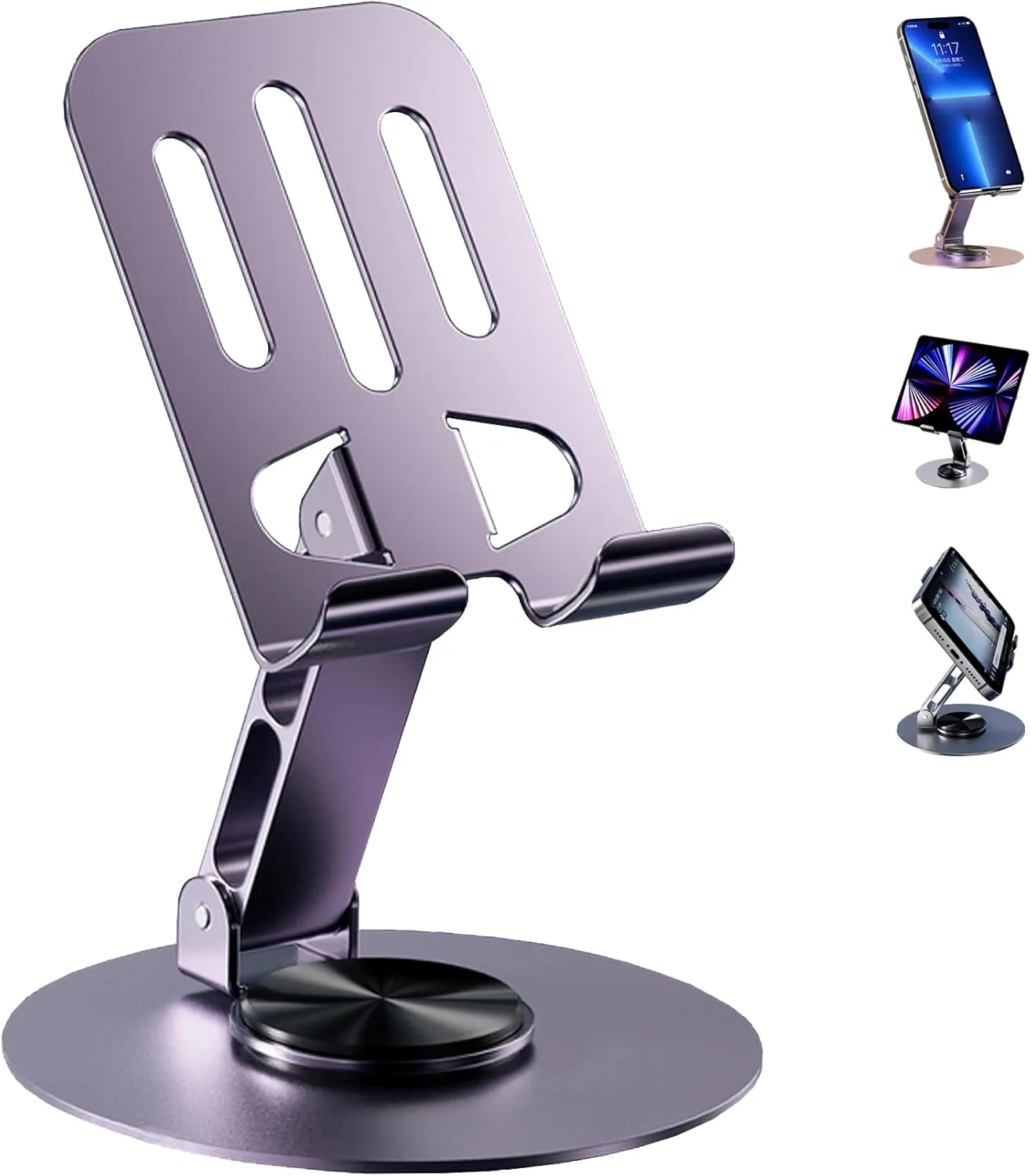Upgrade your workspace or entertainment setup with this adjustable aluminum phone and tablet stand, designed to provide hands-free convenience and improved viewing comfort. Whether you’re watching videos, attending online meetings, reading recipes in the kitchen, or browsing social media, this stand keeps your device securely positioned at the perfect angle. Crafted from high-quality aluminum alloy, the stand offers excellent durability and a sleek modern design that complements any desk or workspace. The adjustable hinge mechanism allows you to tilt your phone or tablet to multiple viewing angles, ensuring maximum comfort while reducing neck strain. The stable round base and anti-slip support keep your device firmly in place, even during frequent use. Its foldable structure also makes it easy to carry, making it ideal for use at home, in the office, during travel, or while studying. Compatible with most smartphones and tablets, including iPhone, Android devices, and iPads, this stand is a practical accessory for anyone who regularly uses mobile devices for work, entertainment, or communication. Simple, stylish, and highly functional, this multi-purpose device stand is a must-have desk accessory for modern digital lifestyles.